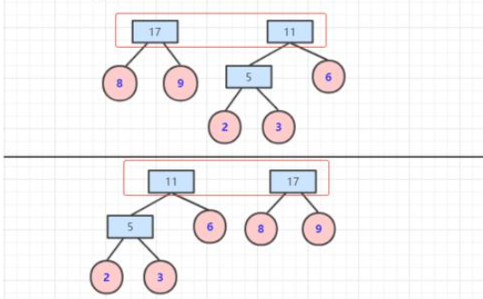 (2) 在森林中选出两个根结点的权值最小的树合并,作为一棵新树的左、右子树,且新树的根结点权值为其左、右子树根结点权值之和;