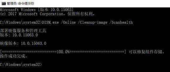 ①打开“命令提示符(管理员)”窗口,然后输入如下命令并回车运行: DISM.exe /Online /Cleanup-image /Scanhealth