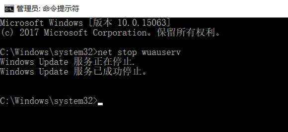 ②在命令提示符窗口中输入 “net stop wuauserv”命令并回车,此时系统会提示服务停止。