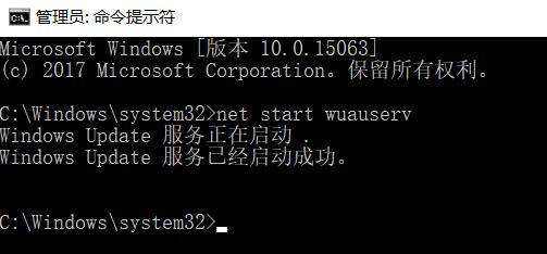 ④在命令提示符窗口中再次输入命令 “net start wuauserv”并回车,此时系统会提示服务重新启动。