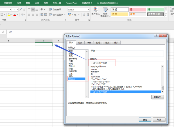 对C1单元格格式进行如下设置:[>9]"";[<5]"";0;@