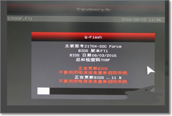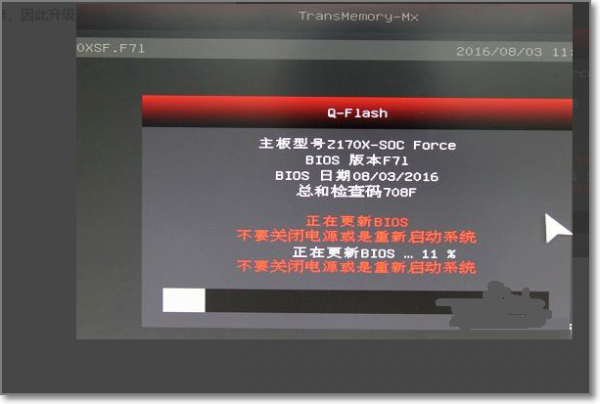 5、注意升级过程不要关闭电源,中途意外断电可能会损坏主板Bios。