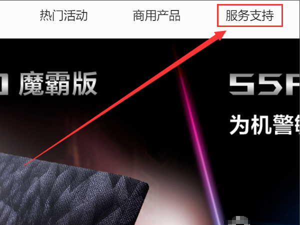 3、进入华硕官网后点击“服务支持”。(一般来说不管什么型号,在它的官网上都会有服务支持这个按钮,如果没有显示的话可以去保修手册或者是保修卡上进行寻找。)