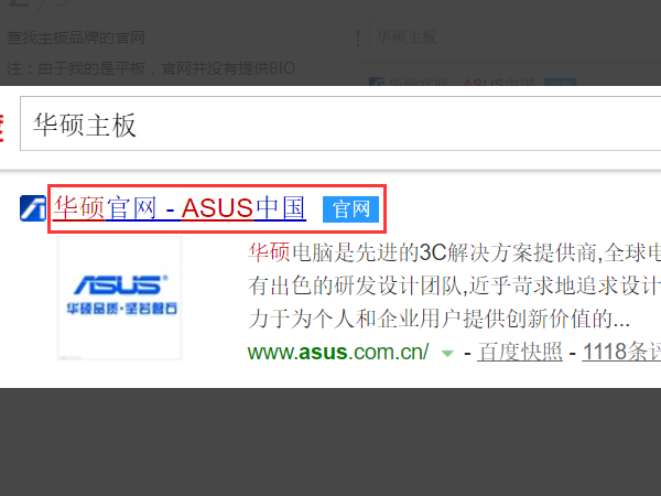 2、查找主板品牌的官方网站,此处以华硕为例,所以搜索华硕官网。
