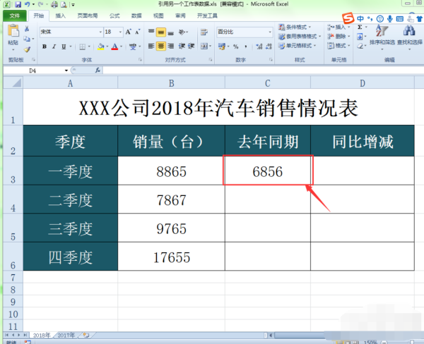 7、公式生效后返回到“2018年”工作中,其中C3单元格中的数据就是引用的“2017年”工作表中的数据。