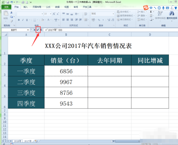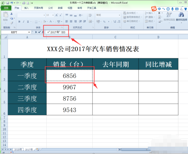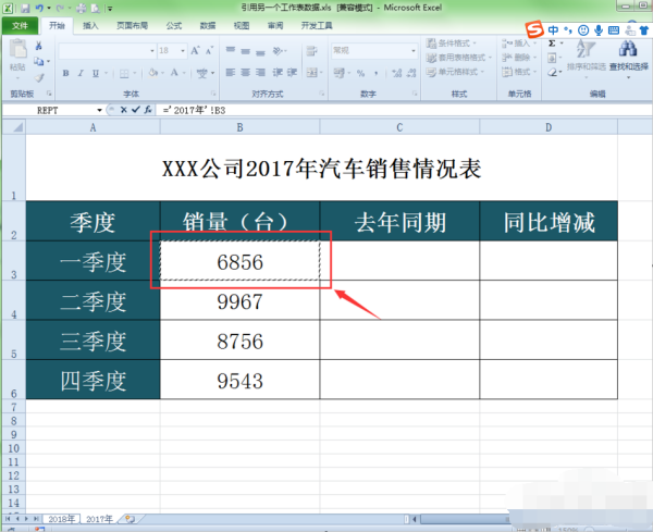 4、然后在”2017年“工作表中单击要引用的数据所在的单元格。这里要引用的数据为B3单元格。