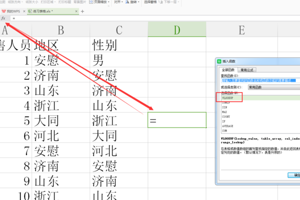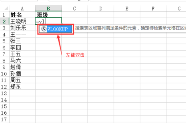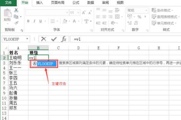 4、输入=vl会自动匹配公式,双击VLOOKUP,如果不匹配,手动输入。