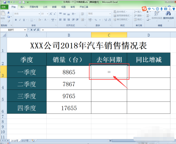 2、选择“2018年”工作表,单击C3单元格,在此单元格中输入公式符号“=”。