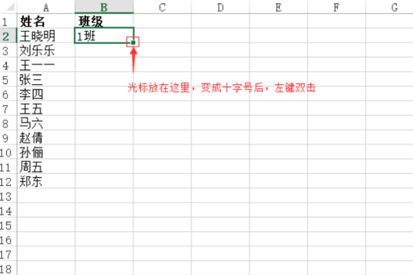 9、光标位于单元格B2的右下角。光标变成十字后,左健双击。