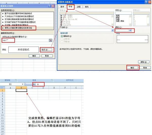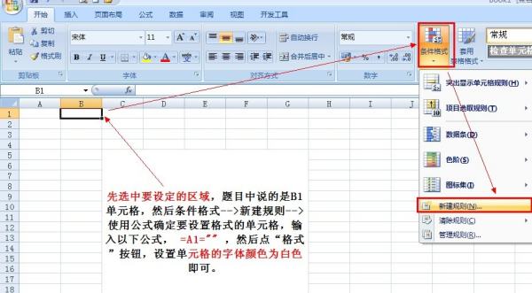 先选中要设定的区域,题目的是B1单元格,然后条件格式-->新建规则-->使用公式确定要设置格式的单元格,输入以下公式,然后点“格式”按钮,设置单元格的字体颜色为白色即可。