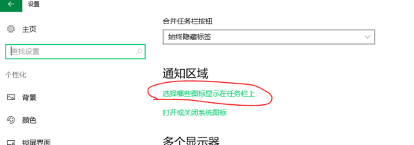 2,点击“选择在任务栏上显示哪些图标”打开如图所示的界面:把“通知区域始终显示所有图标”设置为“开”。