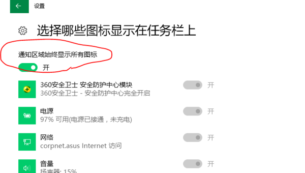 这样设置为“开”图标就会显示在通知区域,而其它没必要显示的图标还是被隐藏起来。