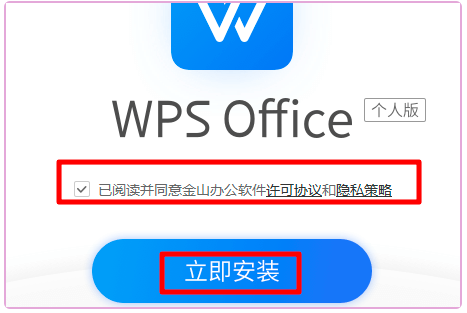 4、双击安装包后,出现安装界面,勾选“阅读并同意金山办公软件的许可协议和隐私政策”,然后点击“立即安装”,软件自动安装;