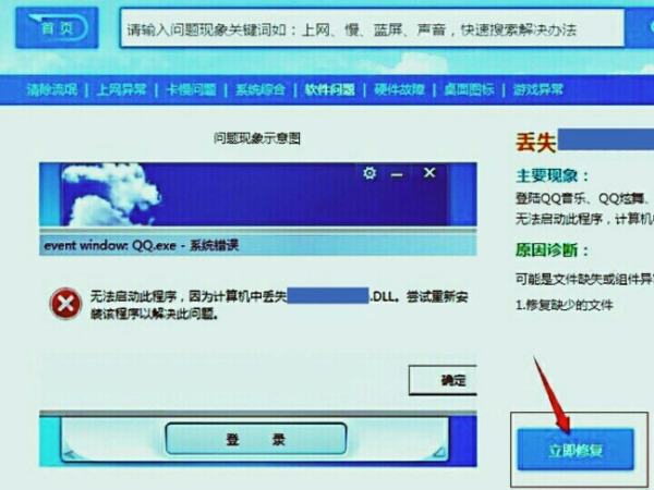 2、选择电脑诊所,在软件硬件下方点击丢失dll文件。