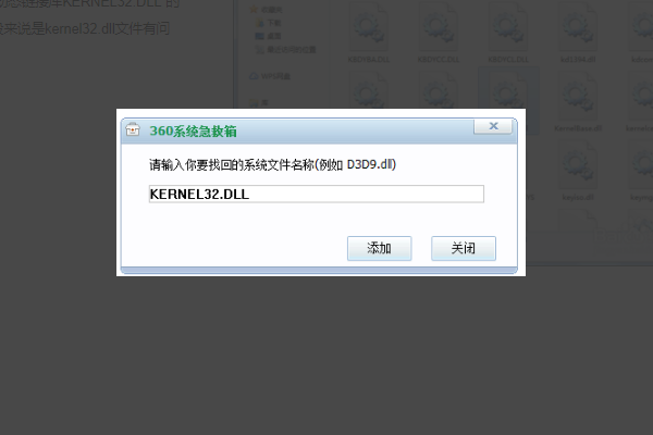 7、在页面上输入“kernel32.dll”,然后点击“添加”,即可修复kernel32.dll,如果在手工添加kernel32.dll提示没有丢失时,我们需要将原来C:/Windows/system32文件夹中的kernel32.dll删除或者剪切到其他目录。