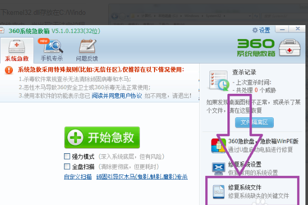 4、点击进入到“系统急救箱”页面,在页面的右侧菜单中可见“修复系统文件”。