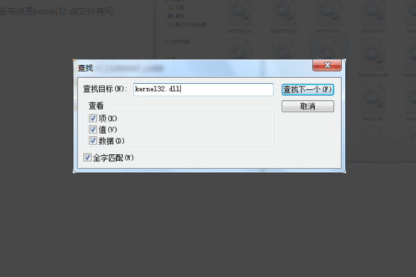 10、点击“查找”,弹出查找的窗口页面,在页面上输入“kernel32.dll”,进行查找,然后搜索找到kernel32.dll相关的项目删除清理。