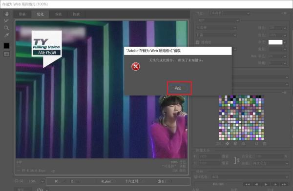 1、导出GIF图片出现未知错误,先点击“确定”返回储存界面。