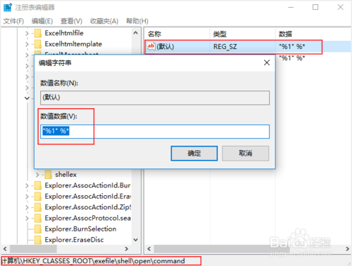 设置command键。现在转到左窗格中的HKEY_CLASSES_ROOT \ exefile \ shell \ open \ command键。然后在右窗格中选择(默认),双击它并将其值数据设置为“%1”%*