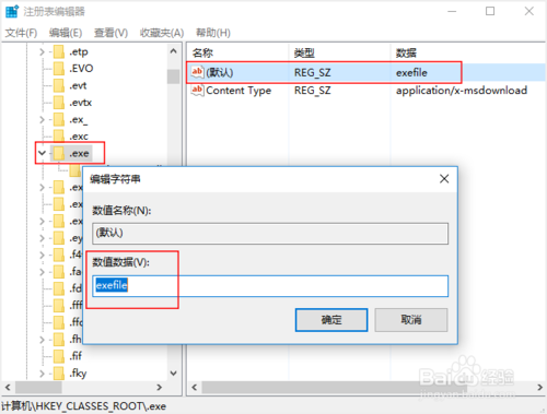 设置.exe。注册表编辑器现在将打开。在左窗格中,转到HKEY_CLASSES_ROOT\.exe。然后在右窗格中,双击“(默认)”键并将数据值设置为exefile。