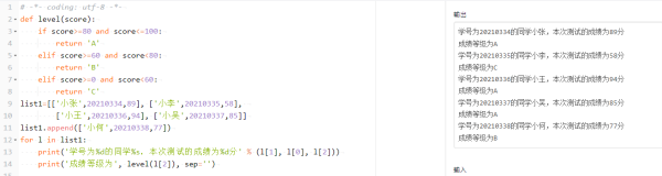 输出实现了添加新记录,打印出了每位同学的信息,并判断了每个人成绩的等级