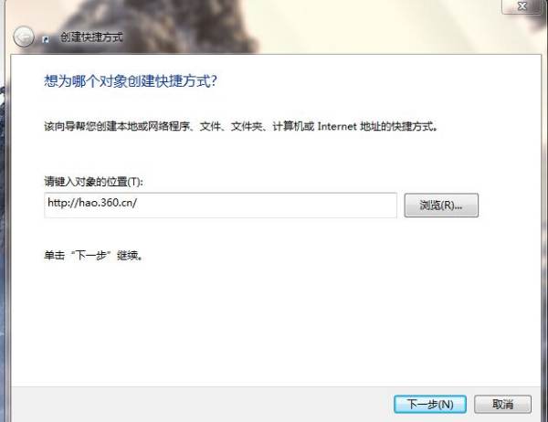 “请键入对象的位置”下面的对话框输入360网址大全的网址。