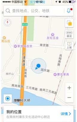 2、看到那个地图上有个圆圈中间有个蓝色显示自己所处的位置,点击蓝色的图标手机底部会有个“我的位置”后面有蓝色“详情”再点击它。