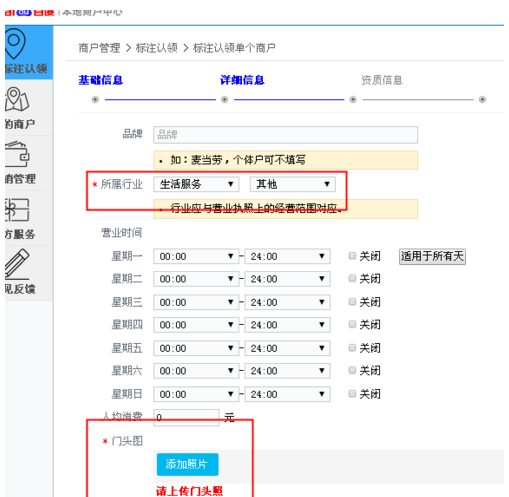 5、填写品牌,所属行业、营业时间、头像,注意带红色*的必须要填写。点击下一步,如下图所示: