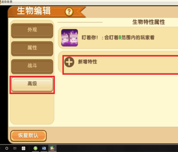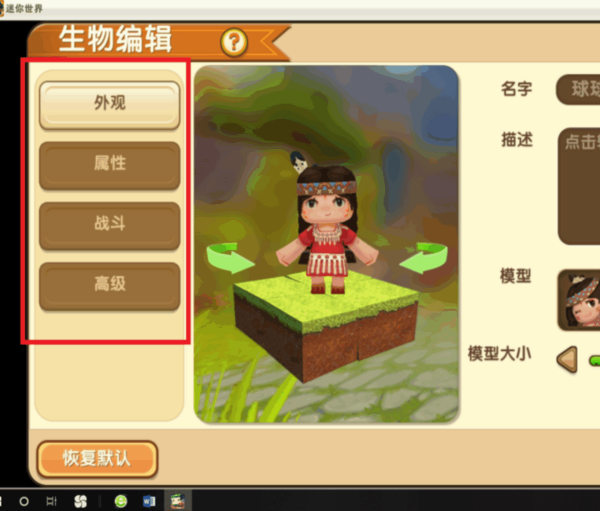 9、在生物编辑左边可以进行此人物的‘属性’,‘战斗’,‘高级’的编辑。