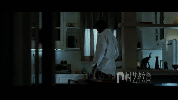 这是全片的第一个镜头,环境声是城市的警笛和楼道隐约的电视音,声音交代了这座城市的不安和嘈杂。清晨,老头S起床上班,他第一件事情是倒掉剩咖啡,并把杯具放在厨房的洗水池中,OK,想必各位看官看到这已经不耐烦了:“就这个动作,有什么好说的?”,那我们暂且跳过,来看看整个画面。这是一个高反差的镜头,明暗对比强烈,前景的布置虚化,只看到一些黑色线条和国际象棋,中景吧台上的物件依次按照大小排列,前景中景将人物框死,让人感受到一丝局促和压力,后景身着白色衬衫的人站在一片白色厨具前。横平竖直的家具构成线条、纯白的家具、整齐的摆件。这不就是一处女座吗?并且还有一定强迫症。
