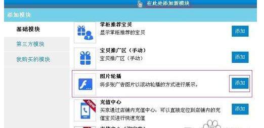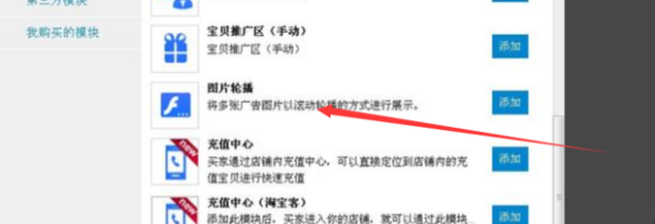 登入卖家中心——店铺装修,在右侧模块点击在此处添加新模块——添加“图片轮播”