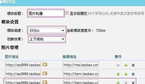 4.点击添加,可增添图片数量。将图片地址和连接地址(链接地址就是点击这张图片轮播,会跳到哪个宝贝详情页或其他页面)黏贴到指定区域。