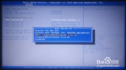 10、通过键盘上的“右(→)方向键”选择“Boot”,然后“下(↓)方向键”选择“BootOption#1”,然后按“enter键”,再按“上(↑)下(↓)键”选择“第三项”或“第四项”即U盘,按“enter键”,然后按“f10键”,电脑保存并重启。
