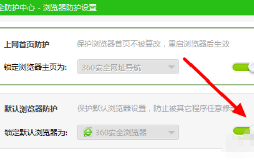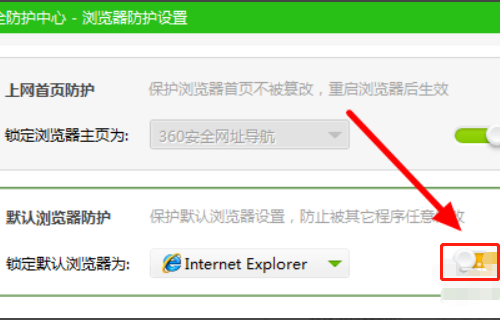 4、此时会弹出360安全防护中心-浏览器防护设置的对话框,用鼠标点击下图红色箭头所指的按钮。