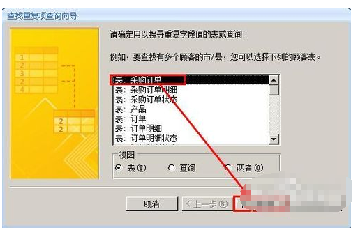3.选择一个表,也就是在这个表中查找重复项,点击下一步。