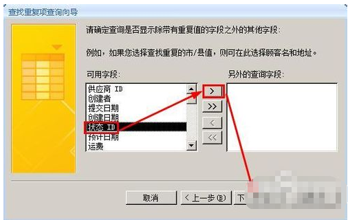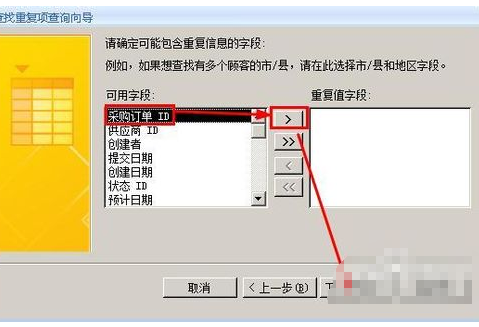 4.选择一个可用字段,我选择了采购订单,然后点击添加按钮,接着点击下一步。