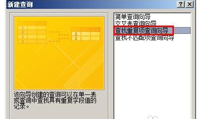 2.在新建查询对话框中,选择查找重复项查询向导,然后点击确定。