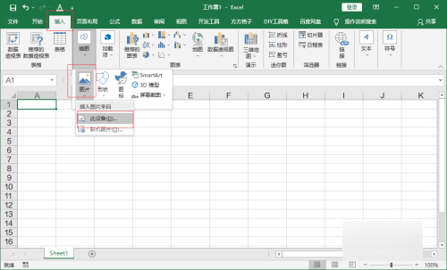 1、打开Excel点击“插入”-“图片”-“此设备”。