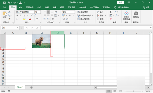 3、选中插入的图片,拖动到C1单元格中,点住C1单元格边线拉宽表格,点住序号1下面的横线拉高表格,使图片填充整个单元格。