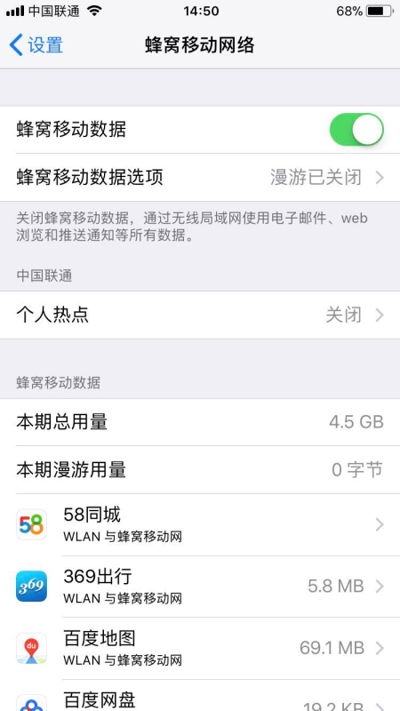 2.检查一下蜂窝移动数据是否已打开:“设置”——“蜂窝移动数据”,绿色图标表示已打开。