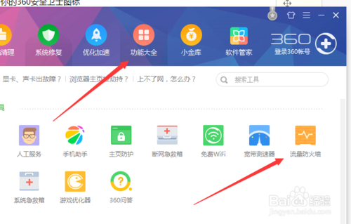 2,在弹出的页面点击功能大全,然后点击流量防火墙.