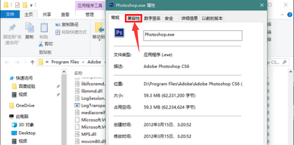 3、在打开的属性窗口中切换到“兼容性”选项卡。如下图所示: