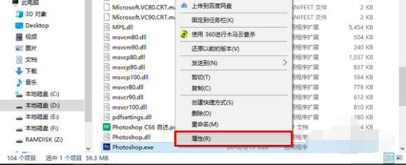 2、在找到的 Photoshop.exe 文件上右击鼠标,选择“属性”。如下图所示: