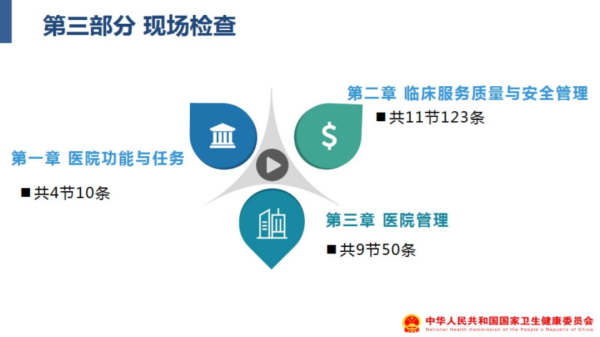 第三部分为现场检查部分。共设 24 节 183 条。用于对三级医院实地评审以及医院自我管理和持续改进。本部分在评审综合得分中的权重不高于 40%。与前版实地评审内容 354 条相比较,此次进行了较大幅度压缩。旨在最大限度减少实地评审工作量,提高工作效率;努力降低评审人员主观评价偏倚,提升标准可操作性和评审结果客观性。