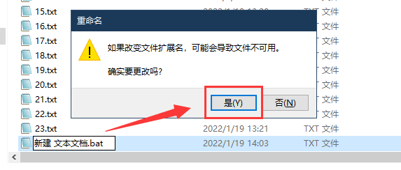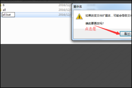 3、然后右键单击文本文档,选择重命名,输入“all.bat”,回车确定,在弹出来的窗口中点击选择“是”、