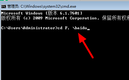 4、在弹出窗口中,输入文件夹所在的磁盘,以F盘为例,输入完成按下“回车”,例如“cd F:\baidu”,输入完成按下“回车”。