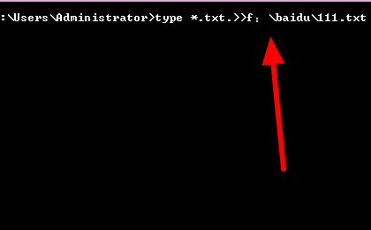 5、输入“type *.txt.>>f:\baidu\111.txt”,按下“回车”键即可。