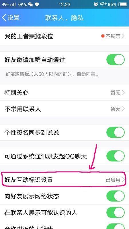 2、“联系人、隐私”点开,开启“好友互动标识设置”。