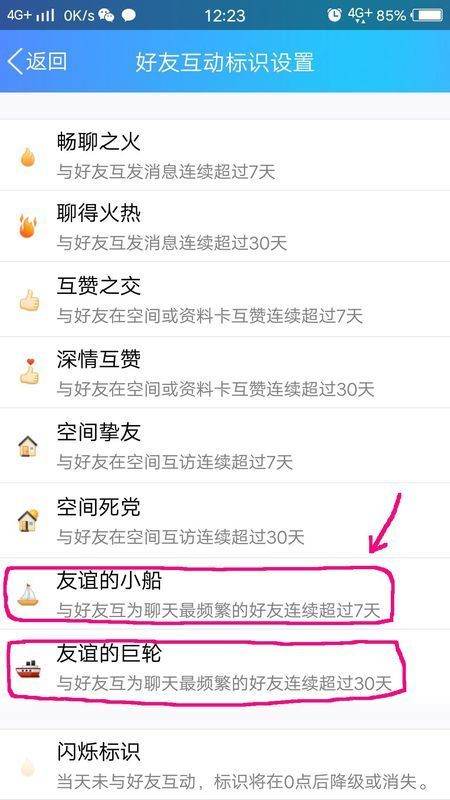 3、好友互动标识设置里面就有“友谊的小船”和“友谊的巨轮”介绍。
