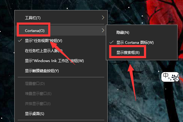 3、右击任务栏,然后点击“Cortana”按钮,这时可以在展开的选项中找到“显示搜索框”选项: